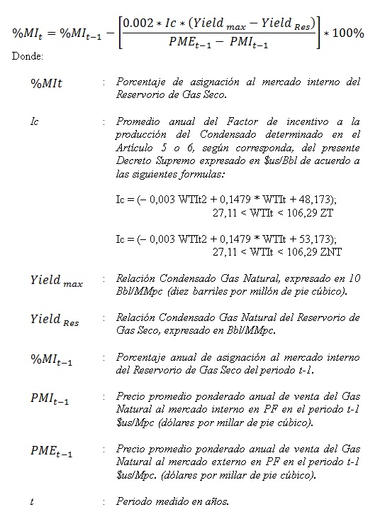 "I. Los Nuevos Reservorios de Gas Seco aportarán anualmente al mercado interno un porcentaje de volumen de Gas Natural de la producción anual referida al año anterior, de acuerdo a la siguiente fórmula:
